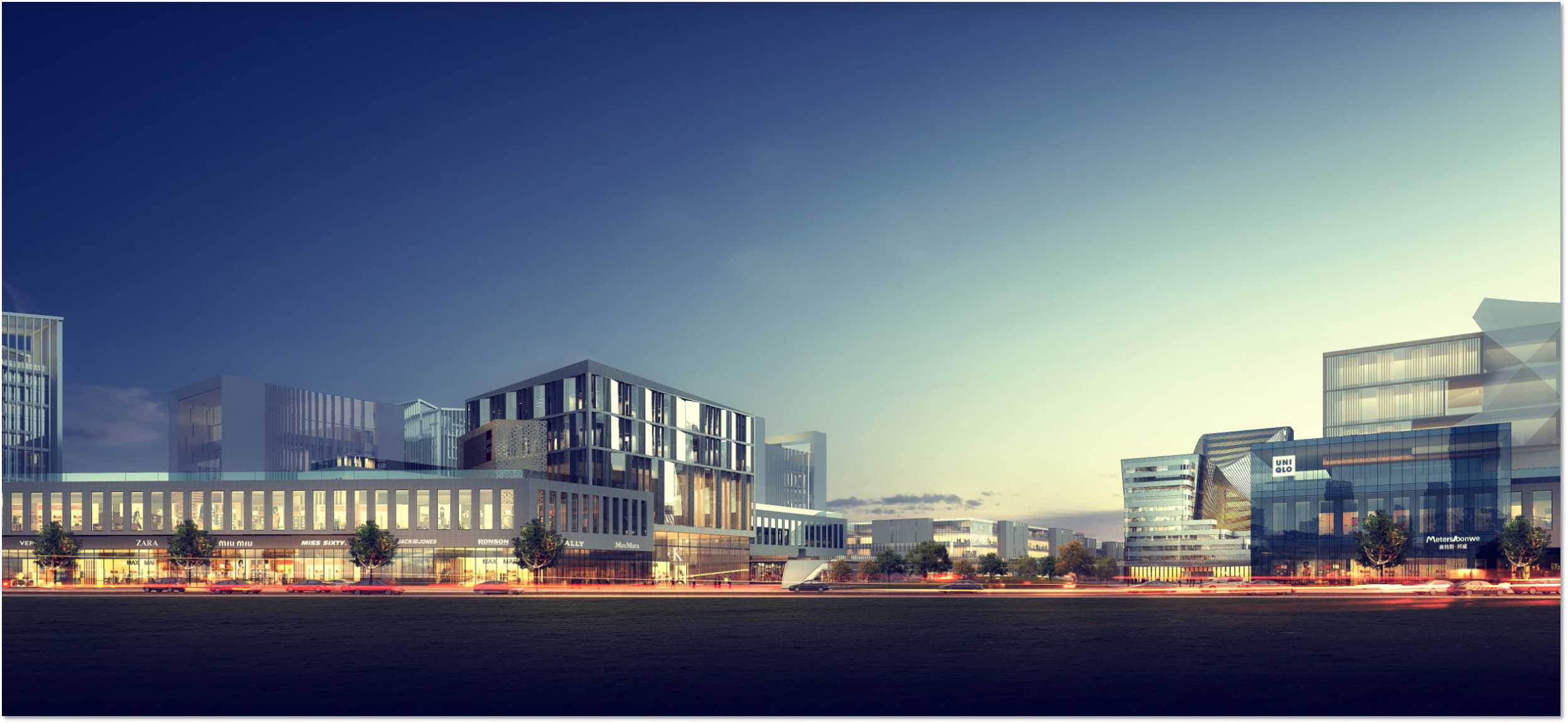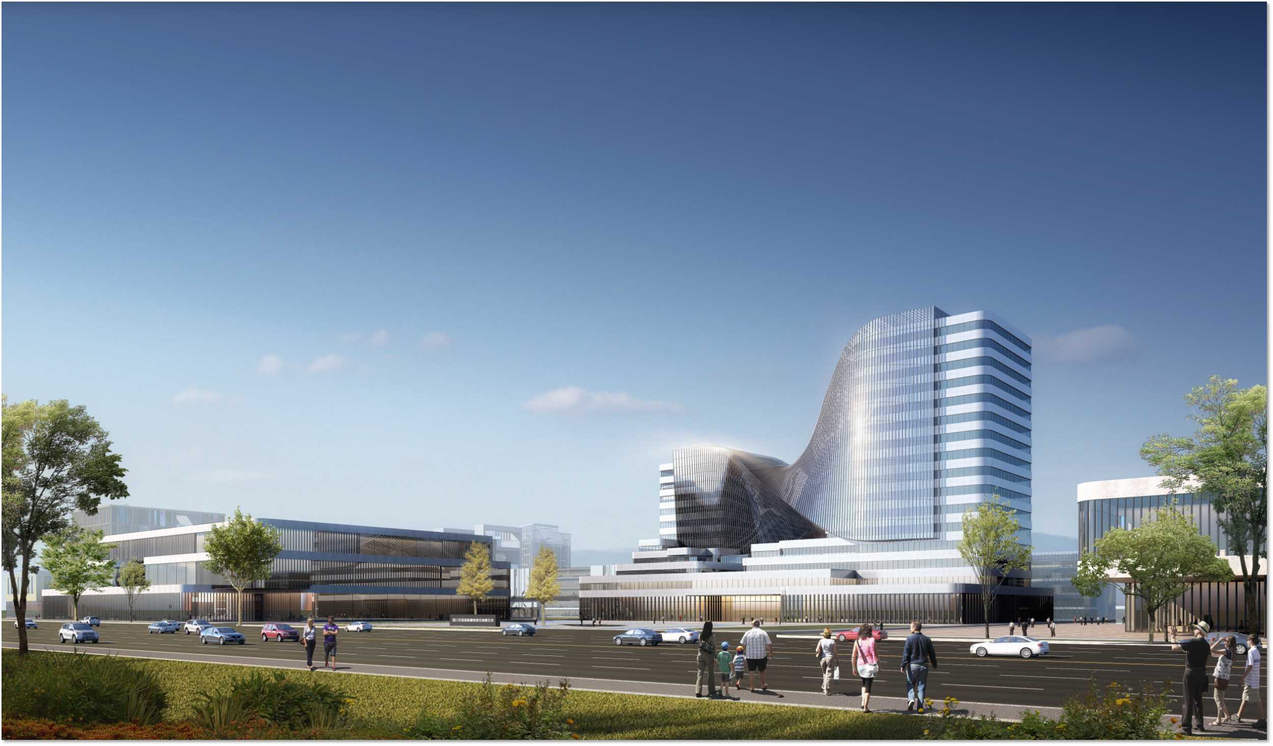 建筑外形設計上以一張“網”罩住兩個主要體量,形成優(yōu)雅的天際線,與共享、生態(tài)、交流的新空間。呼應人工智能總部主題,傳達“網連天下、智慧之谷”的建筑概念。建筑退臺適應形象與景觀軸線,視野直達河濱。